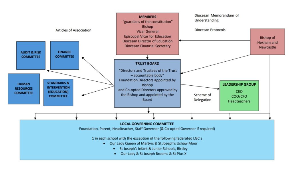We have five Members who are the guardians of the constitution, determining the governance structure of the Trust and provide oversight and challenge to the Directors to ensure the charitable objectives of the Trust are being fulfilled and a Catholic education is provided. Members approve the Articles of Association and have the power to appoint and remove the Directors. Members appoint the Directors with the right skills to ensure the Trust is run in accordance with its aims and objectives. In view of the overarching role of the Members, the Bishop of Hexham and Newcastle is a Member and appoints other Members from within the Diocese of Hexham and Newcastle. Members are independent of the Directors.